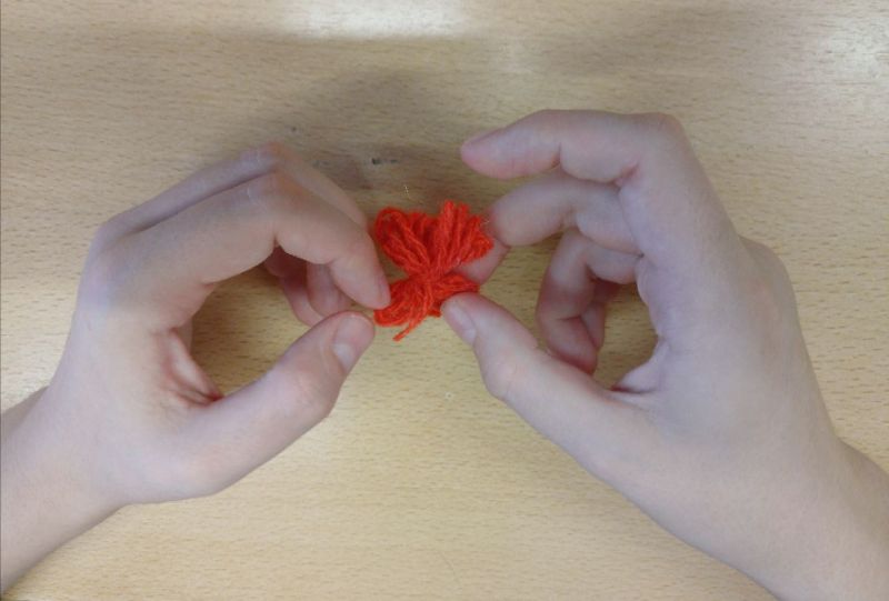 💢 Юноша и девушка трудились над изготовлением открытки из пряжи. Надо отметить, что работа была очень кропотливой! Сначала они приклеивали нити пряжи в определённом порядке на картон. Получилось что-то наподобие домотканого коврика. Потом этот "коврик" закрывали вторым картоном, где были вырезаны кошечки и окошко. Склеив оба картона, декорировали открытки шерстяными цветочками и деревянными сердечками.
