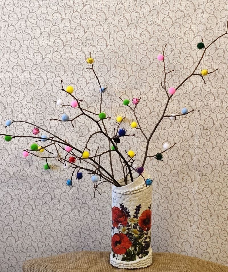 🔵⚪🔴 Сегодня в нашей мастерской благодаря нашей рукодельнице произошло маленькое чудо: были веточки без листиков, а стали с яркими кругляшками! Вот такой весёлый букет получился!👍