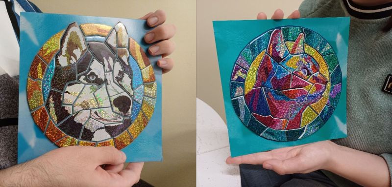 ⚡ И это была не просто аппликация, а настоящая головоломка с голографическими деталями. Работа строилась следующим образом: сначала мы подбирали нужные элементы по схеме, ориентируясь по контуру деталей на картоне-основе. Затем приклеивали объёмные детали на правильные места. И у нас получились переливающиеся всеми цветами радуги портреты четвероногих друзей в витражном стиле!
