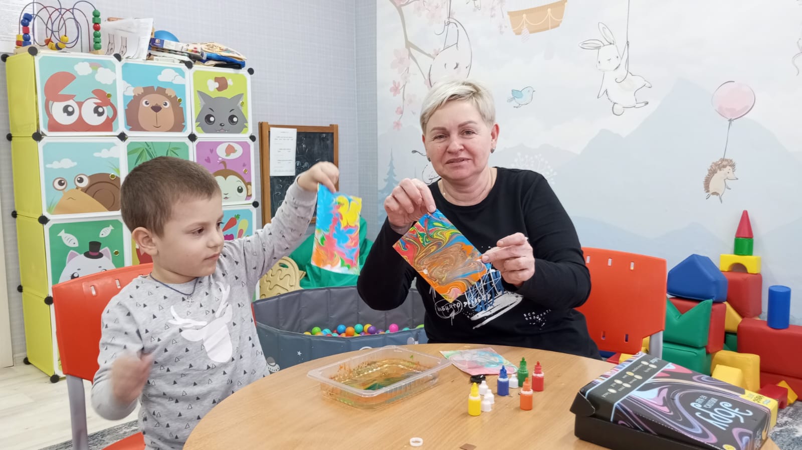 Продолжается работа с детьми с РАС и другими ментальными нарушениями. Инструктор по труду обучила детей новой технике рисования «Эбру» – рисованию на воде, которая способствует творческому выражению негативных эмоций, таких как агрессия и гнев. Социальный педагог провела дидактическую игру «Собери капельки в стакан», направленную на формирование навыков произношения основных цветов и развитие мелкой моторики рук. Психолог использовала «Набор Фребеля», игра с кубиками которого способствует развитию у детей пространственного мышления и конструктивных навыков. Занятия «Логоритмикой» включали в себя выполнение заданий с использованием движений, слов и музыкального сопровождения. Инструктор ЛФК провела комплексные упражнения для физического развития.
