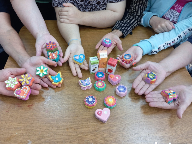 👭 Отдыхающие отделения дневного пребывания изготовили аромакамни из гипса. Раскрасили красками и задекорировали стразами. 🎨🖌