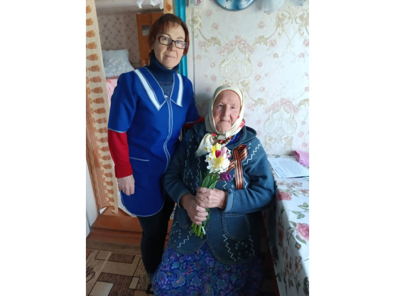 В преддверии 79-ой годовщины Победы социальный работник с. Ризоватово Мамаева И.А. поздравила свою подопечную, труженицу тыла Седову Екатерину Степановну. В качестве знака уважения и признания вручила цветы и атрибутику дня Победы - георгиевскую ленточку