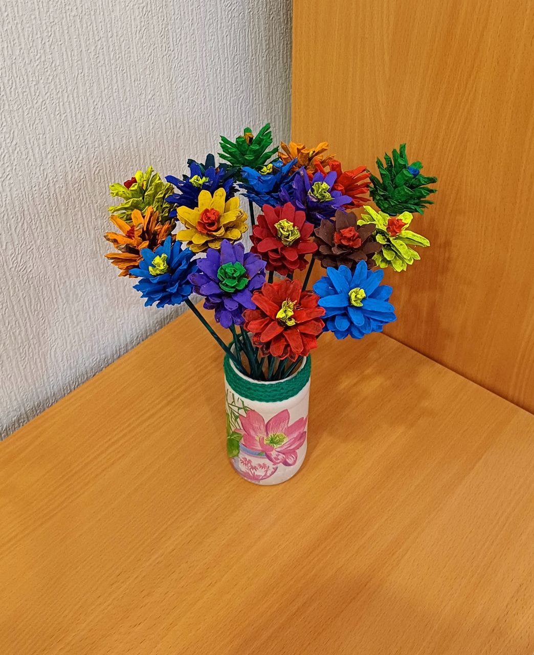 Такая поделка может быть прекрасным украшением не только для осенней выставки, но и интерьера любого дома. Цветы из шишек долго простоят, не увянут и будут только радовать!